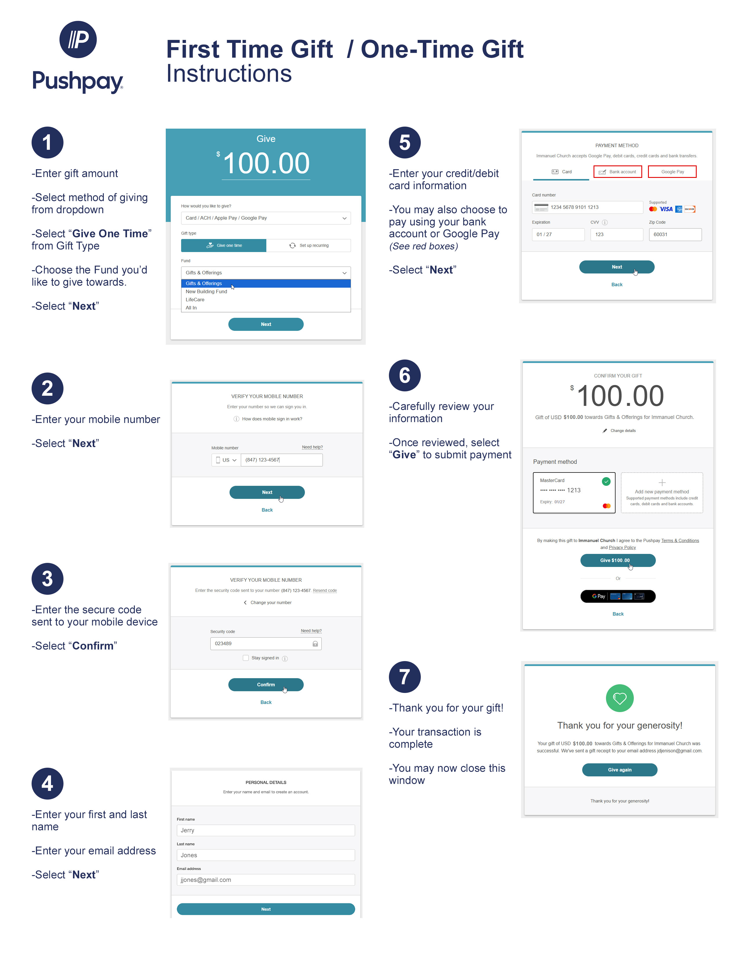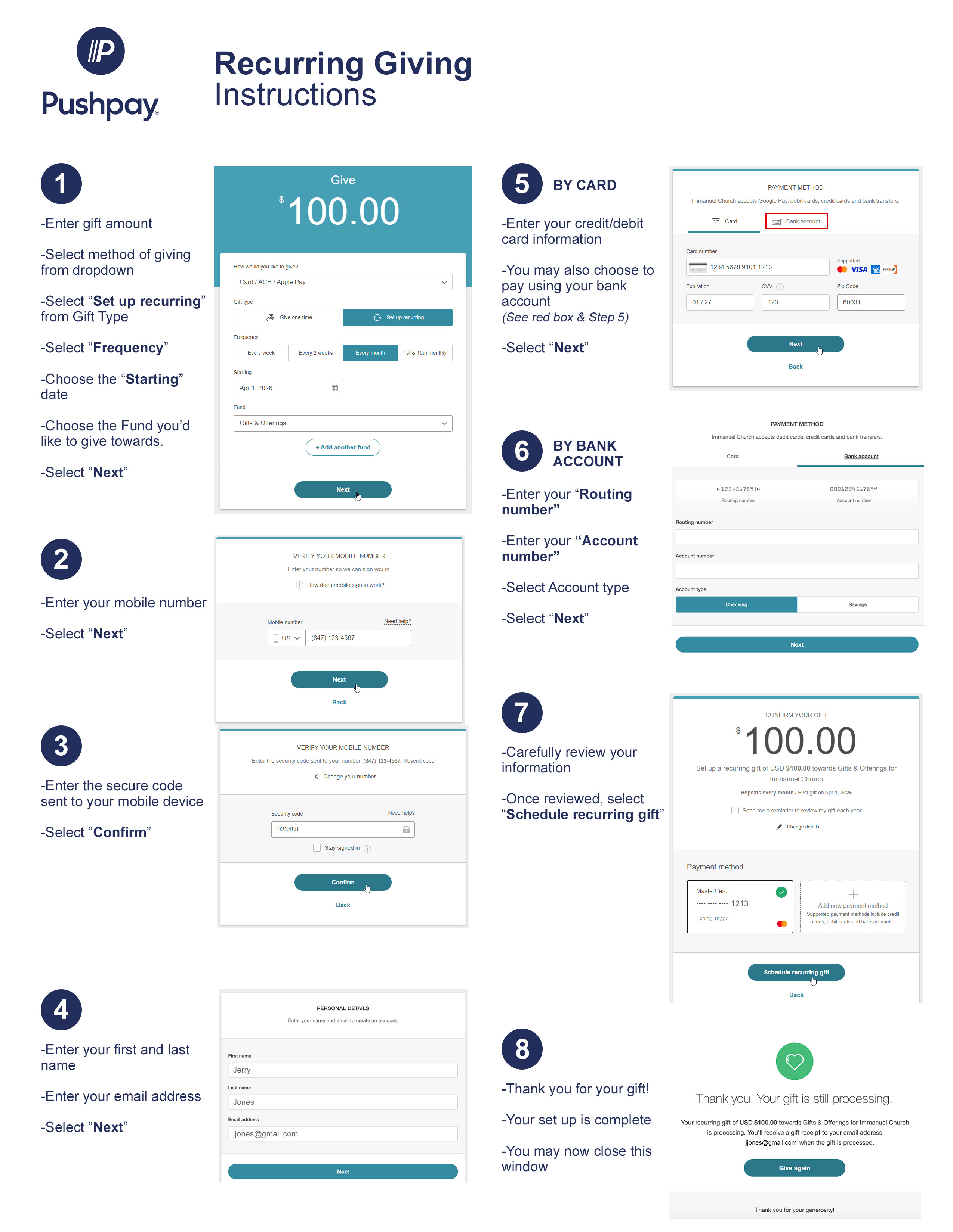 We have recently changed online giving platforms to PushPay. Your previous recurring giving will remain in effect. If you would like to change your recurring giving you will change it in PushPay. See instructions below.