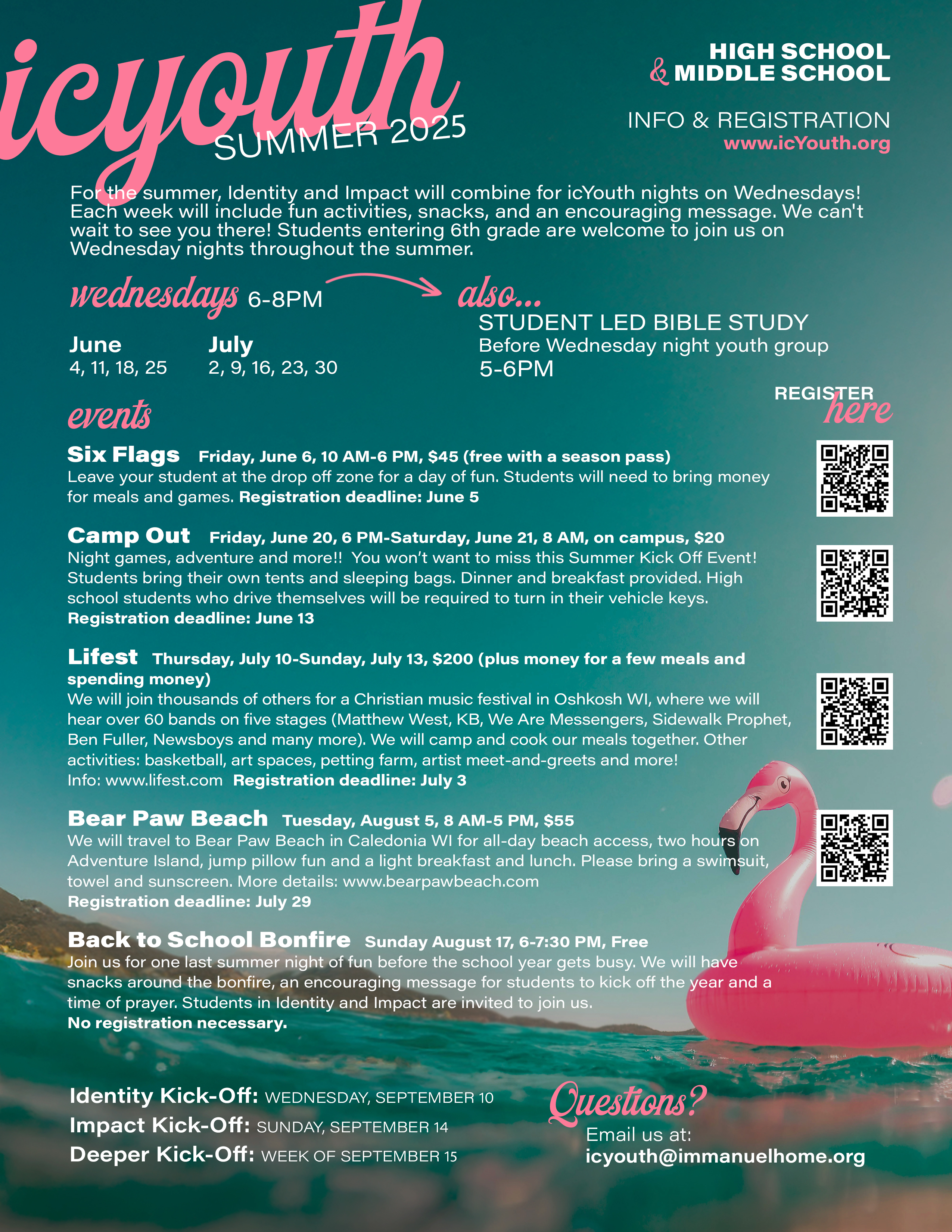 icYouth is all about students. Our goal is to provide an environment for your teenager to think, believe, and practice... together. The seven years of middle school and high school can be challenging as new ideas, academic stress, and relationships all become more prevalent; students are trying to figure out who they are and what life is all about. Each time we gather together we want them to feel accepted, loved, and supported as they navigate all of it, and we want to do that consistently. So we've put together a team of volunteers with huge hearts and listening ears, ready to help your student make their relationship with Jesus their own.