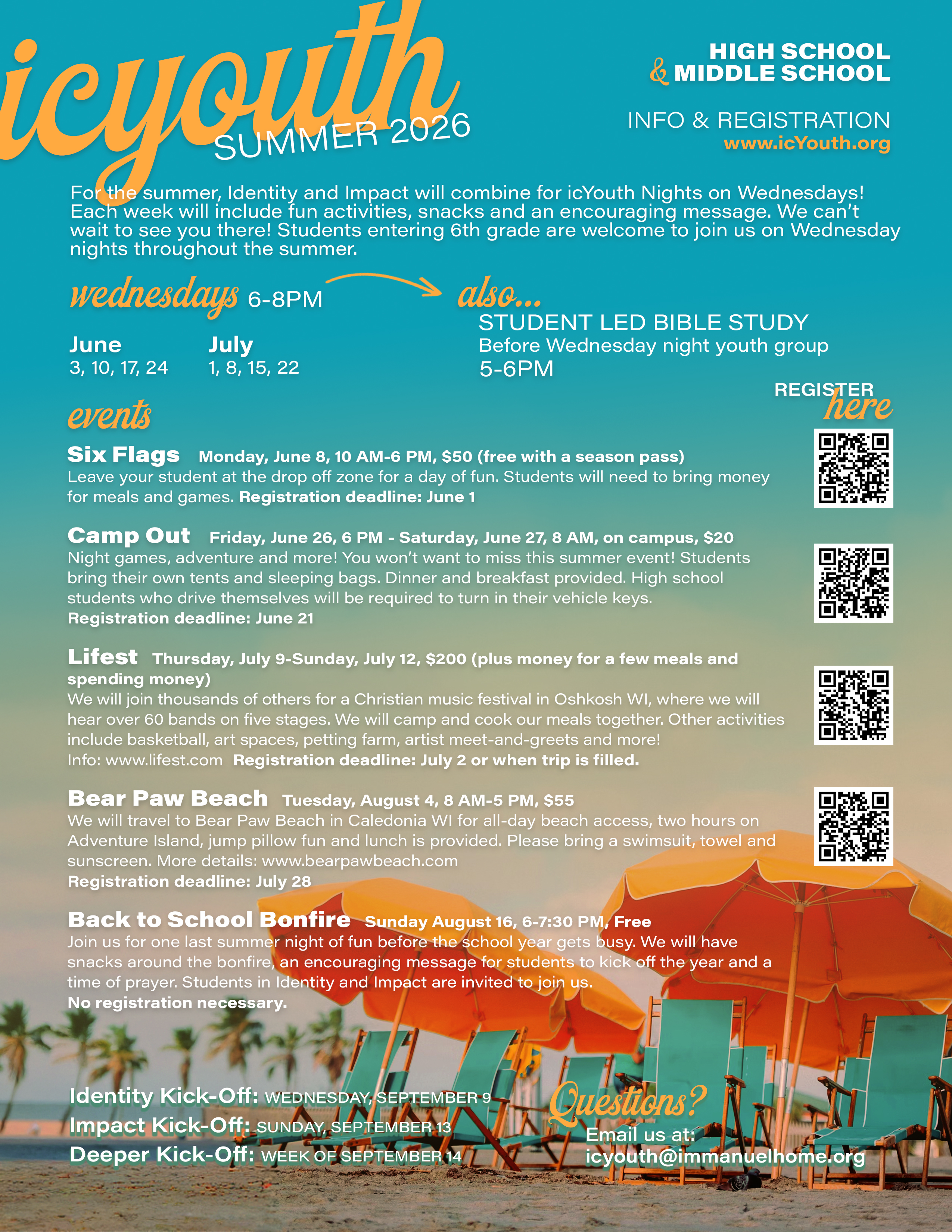 For the summer, Identity and Impact will combine for icYouth Nights on Wednesdays! Each week will include fun activities, snacks and an encouraging message. We can’t wait to see you there! Students entering 6th grade are welcome to join us on Wednesday nights throughout the summer.